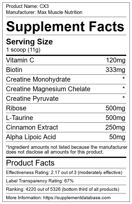 CX3 is a pre-workout supplement manufactured by Max Muscle Nutrition. It ranks 1,717 out of 1,898 pre-workout supplements and earned an overall thumbs-down recommendation based on seven factors including nutrition label transparency, ingredients, dosing, claims, research rating, and ranking.