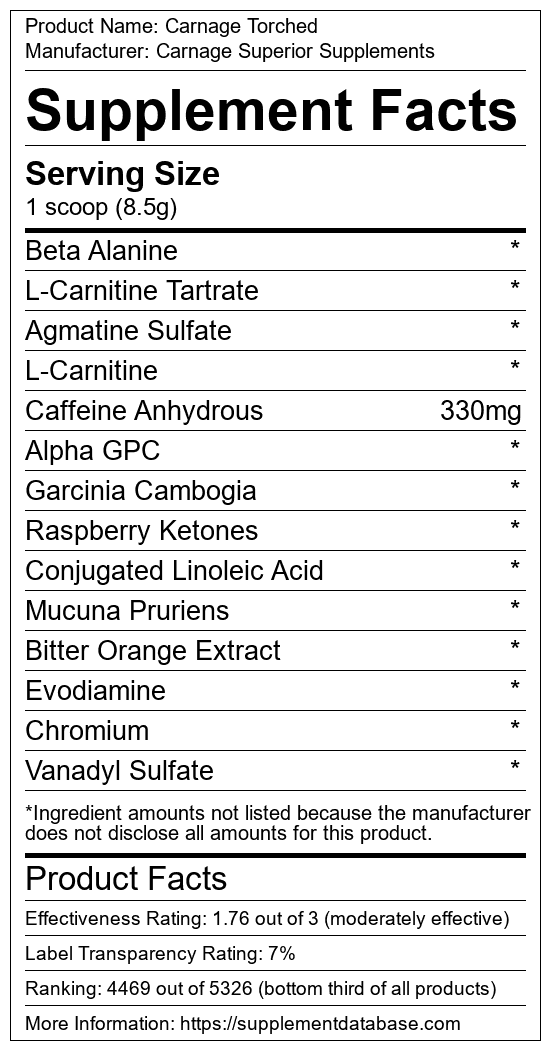 Carnage Torched is a fat burning supplement manufactured by Carnage Superior Supplements. It ranks 618 out of 719 fat burning supplements and earned an overall thumbs-down recommendation based on seven factors including nutrition label transparency, ingredients, dosing, claims, research rating, and ranking.