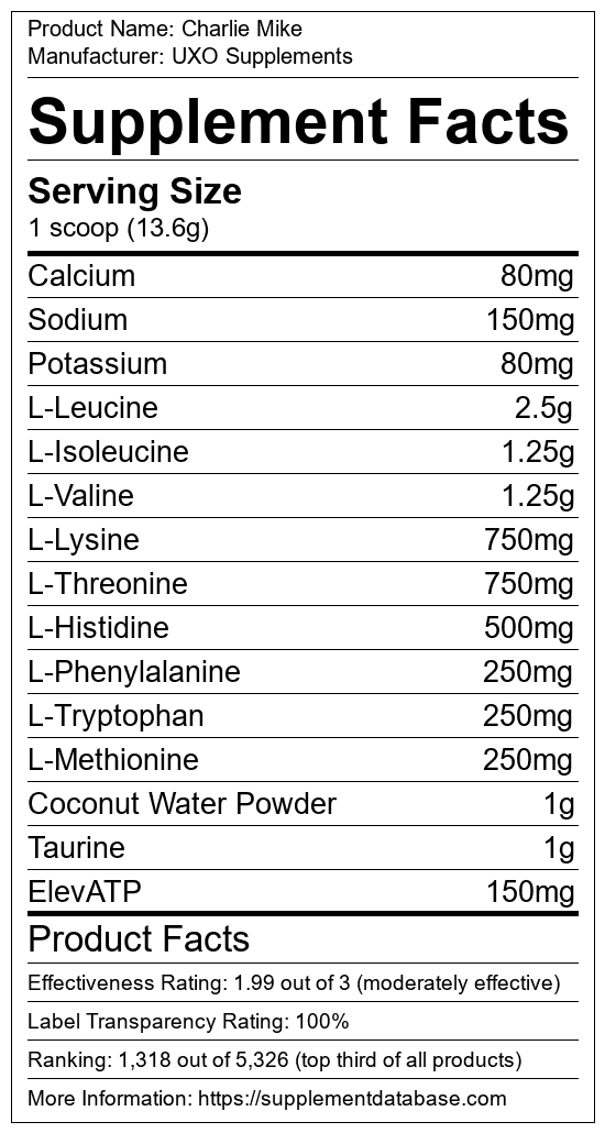 Charlie Mike is an intra-workout supplement manufactured by UXO Supplements. It ranks 108 out of 339 intra-workout supplements and earned an overall thumbs-up recommendation based on seven factors including nutrition label transparency, ingredients, dosing, claims, research rating, and ranking.