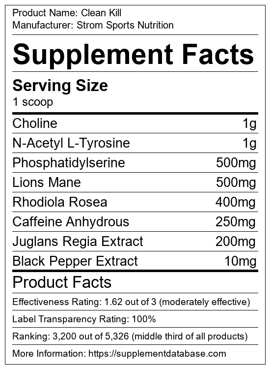 Clean Kill is a gaming supplement manufactured by Strom Sports Nutrition. It ranks 27 out of 46 gaming supplements and earned an overall thumbs-down recommendation based on seven factors including nutrition label transparency, ingredients, dosing, claims, research rating, and ranking.