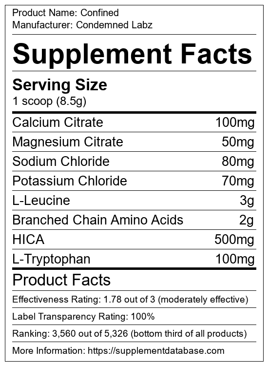Confined is a post-workout supplement manufactured by Condemned Labz. It ranks 385 out of 515 post-workout supplements and earned an overall thumbs-down recommendation based on seven factors including nutrition label transparency, ingredients, dosing, claims, research rating, and ranking.