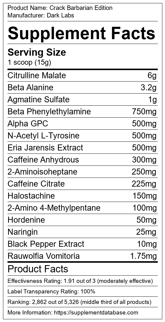 Crack Barbarian Edition is a pre-workout supplement manufactured by Dark Labs. It ranks 1,263 out of 1,898 pre-workout supplements and earned an overall thumbs-down recommendation based on seven factors including nutrition label transparency, ingredients, dosing, claims, research rating, and ranking.