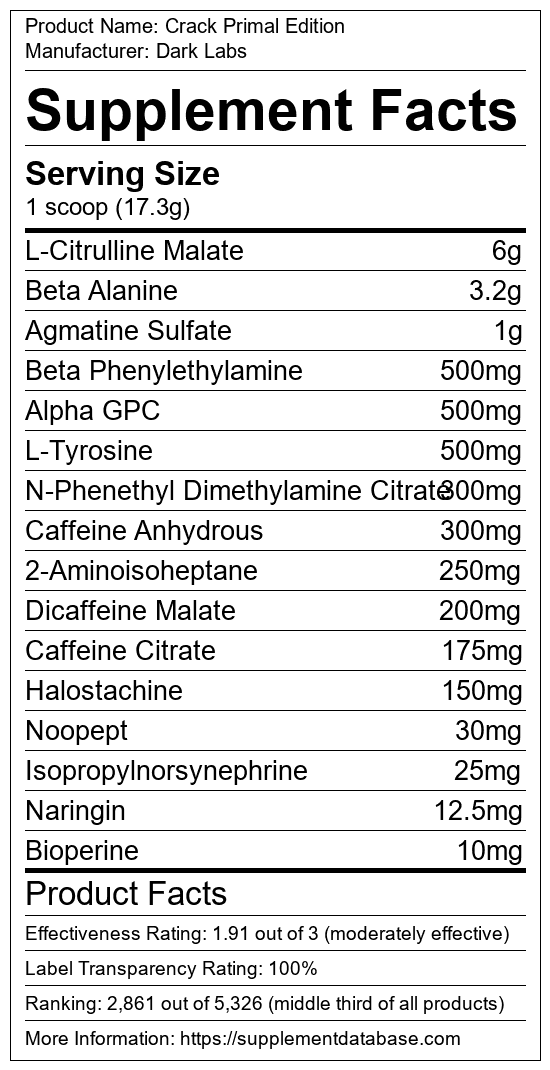Crack Primal Edition is a pre-workout supplement manufactured by Dark Labs. It ranks 1,262 out of 1,898 pre-workout supplements and earned an overall thumbs-down recommendation based on seven factors including nutrition label transparency, ingredients, dosing, claims, research rating, and ranking.