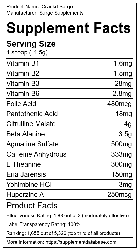 Crankd Surge is a pre-workout supplement manufactured by Surge Supplements. It ranks 738 out of 1,898 pre-workout supplements and earned an overall thumbs-up recommendation based on seven factors including nutrition label transparency, ingredients, dosing, claims, research rating, and ranking.