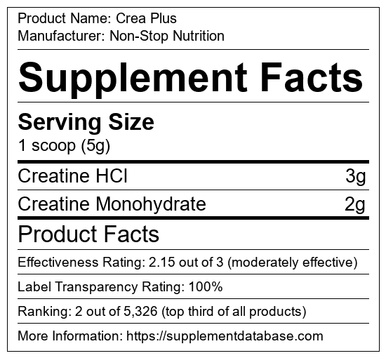 Crea Plus is a post-workout supplement manufactured by Non-Stop Nutrition. It ranks 1 out of 515 post-workout supplements and earned an overall thumbs-up recommendation based on seven factors including nutrition label transparency, ingredients, dosing, claims, research rating, and ranking.