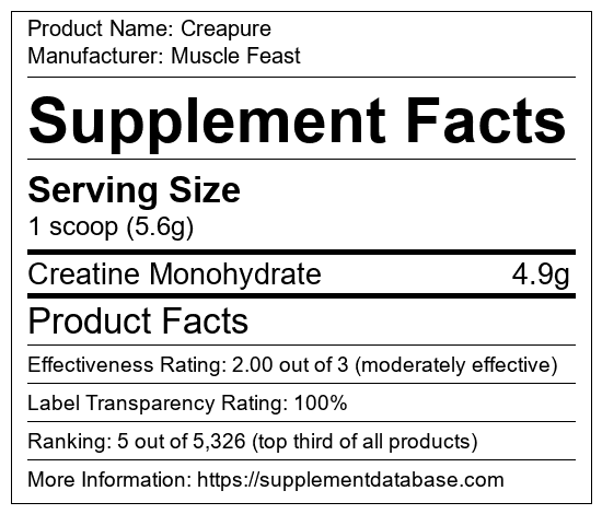 Creapure is a post-workout supplement manufactured by Muscle Feast. It ranks 3 out of 515 post-workout supplements and earned an overall thumbs-up recommendation based on seven factors including nutrition label transparency, ingredients, dosing, claims, research rating, and ranking.