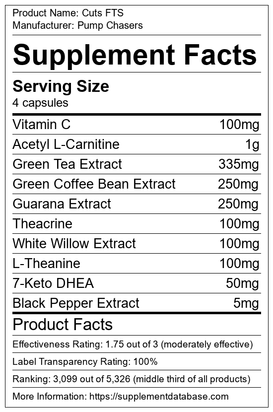 Cuts FTS is a fat burning supplement manufactured by Pump Chasers. It ranks 441 out of 719 fat burning supplements and earned an overall thumbs-down recommendation based on seven factors including nutrition label transparency, ingredients, dosing, claims, research rating, and ranking.