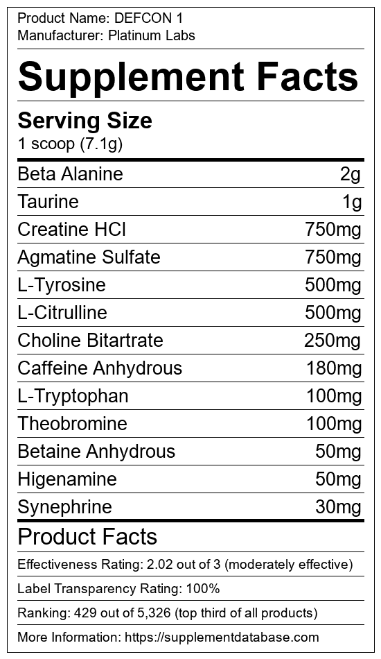 DEFCON 1 is a pre-workout supplement manufactured by Platinum Labs. It ranks 179 out of 1,898 pre-workout supplements and earned an overall thumbs-up recommendation based on seven factors including nutrition label transparency, ingredients, dosing, claims, research rating, and ranking.