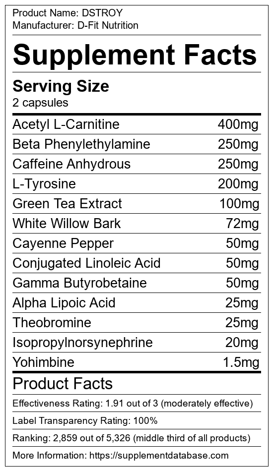 DSTROY is a fat burning supplement manufactured by D-Fit Nutrition. It ranks 331 out of 719 fat burning supplements and earned an overall thumbs-down recommendation based on seven factors including nutrition label transparency, ingredients, dosing, claims, research rating, and ranking.