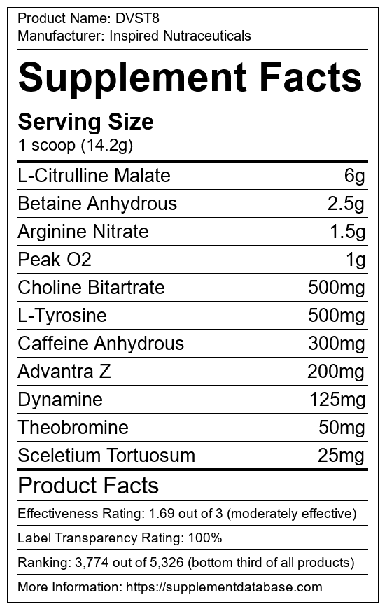 DVST8 is a pre-workout supplement manufactured by Inspired Nutraceuticals. It ranks 1,538 out of 1,898 pre-workout supplements and earned an overall thumbs-down recommendation based on seven factors including nutrition label transparency, ingredients, dosing, claims, research rating, and ranking.