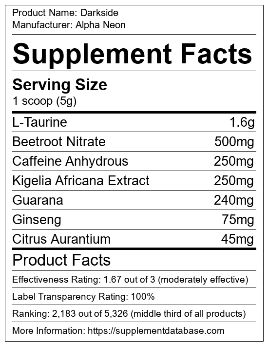 Darkside is a pre-workout supplement manufactured by Alpha Neon. It ranks 1,040 out of 1,898 pre-workout supplements and earned an overall thumbs-up recommendation based on seven factors including nutrition label transparency, ingredients, dosing, claims, research rating, and ranking.