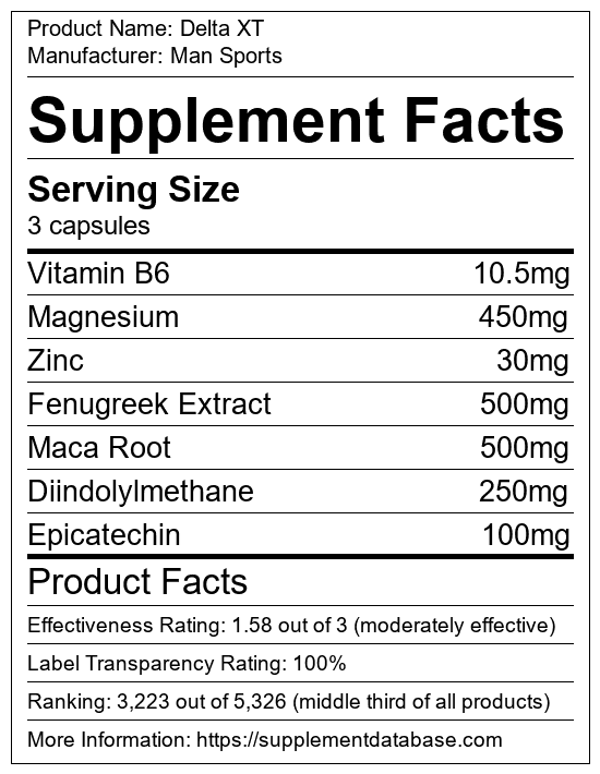 Delta XT is a testosterone booster manufactured by Man Sports. It ranks 207 out of 321 testosterone boosters and earned an overall thumbs-down recommendation based on seven factors including nutrition label transparency, ingredients, dosing, claims, research rating, and ranking.
