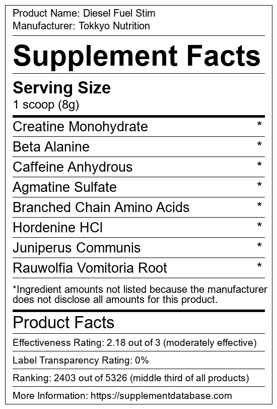 Diesel Fuel Stim is a pre-workout supplement manufactured by Tokkyo Nutrition. It ranks 1,127 out of 1,898 pre-workout supplements and earned an overall thumbs-down recommendation based on seven factors including nutrition label transparency, ingredients, dosing, claims, research rating, and ranking.