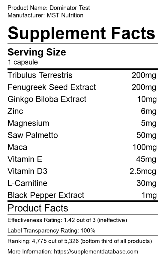 Dominator Test is a testosterone booster manufactured by MST Nutrition. It ranks 295 out of 321 testosterone boosters and earned an overall thumbs-down recommendation based on seven factors including nutrition label transparency, ingredients, dosing, claims, research rating, and ranking.