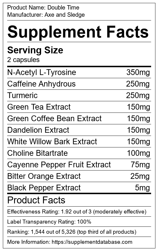 Double Time is a fat burning supplement manufactured by Axe and Sledge. It ranks 155 out of 719 fat burning supplements and earned an overall thumbs-up recommendation based on seven factors including nutrition label transparency, ingredients, dosing, claims, research rating, and ranking.