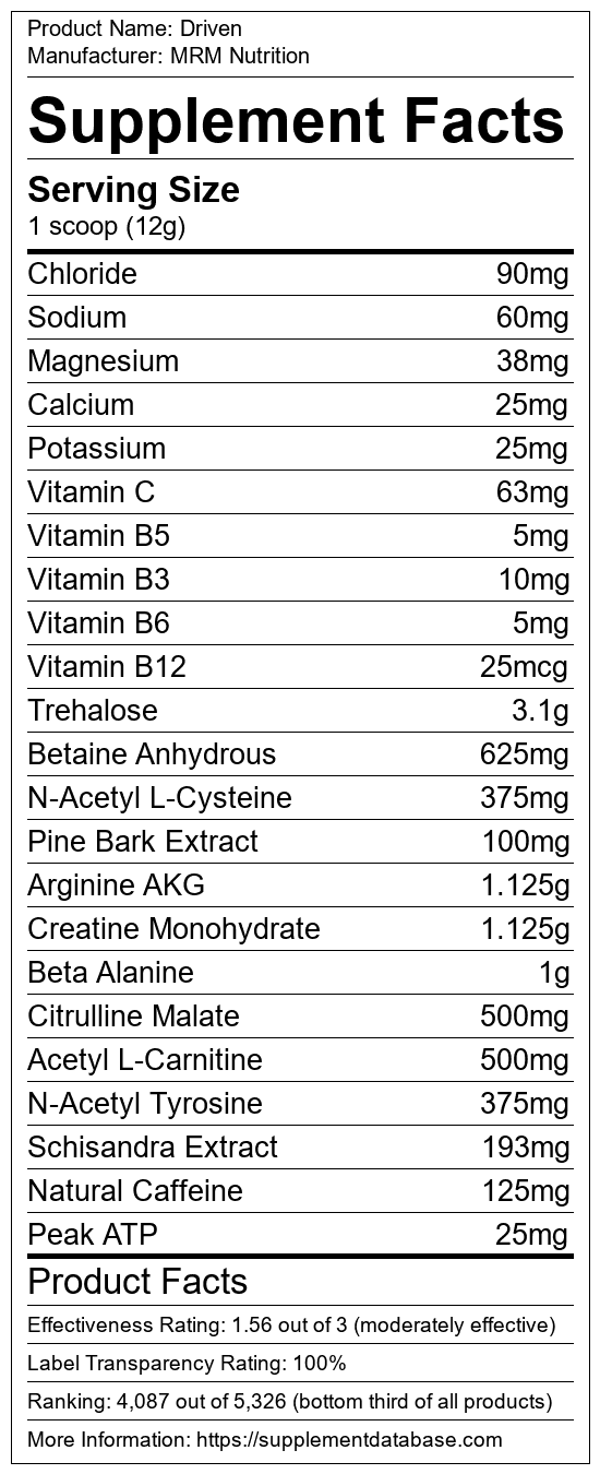 Driven is a pre-workout supplement manufactured by MRM Nutrition. It ranks 1,674 out of 1,898 pre-workout supplements and earned an overall thumbs-down recommendation based on seven factors including nutrition label transparency, ingredients, dosing, claims, research rating, and ranking.