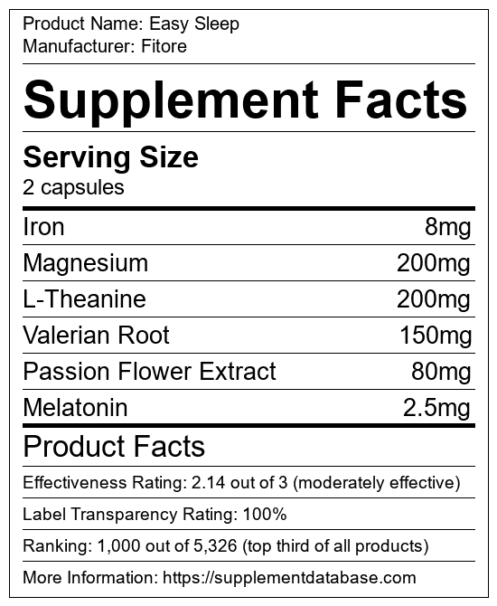 Easy Sleep is a sleep aid manufactured by Fitore. It ranks 95 out of 215 sleep aids and earned an overall thumbs-up recommendation based on seven factors including nutrition label transparency, ingredients, dosing, claims, research rating, and ranking.