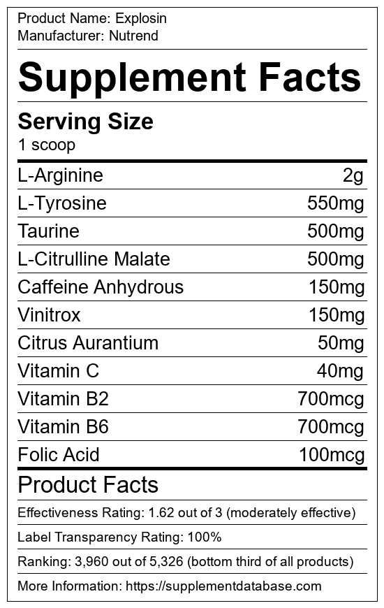 Explosin is a pre-workout supplement manufactured by Nutrend. It ranks 1,627 out of 1,898 pre-workout supplements and earned an overall thumbs-down recommendation based on seven factors including nutrition label transparency, ingredients, dosing, claims, research rating, and ranking.