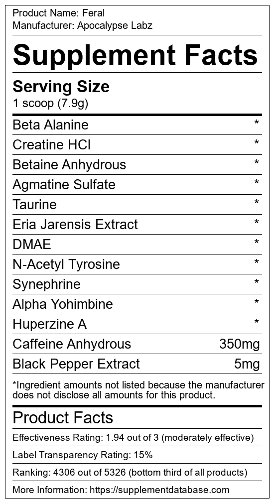 Feral is a pre-workout supplement manufactured by Apocalypse Labz. It ranks 1,732 out of 1,898 pre-workout supplements and earned an overall thumbs-down recommendation based on seven factors including nutrition label transparency, ingredients, dosing, claims, research rating, and ranking.