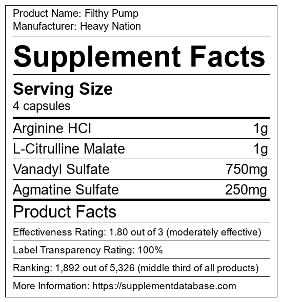 Filthy Pump is a pump supplement manufactured by Heavy Nation. It ranks 144 out of 322 pump supplements and earned an overall thumbs-up recommendation based on seven factors including nutrition label transparency, ingredients, dosing, claims, research rating, and ranking.