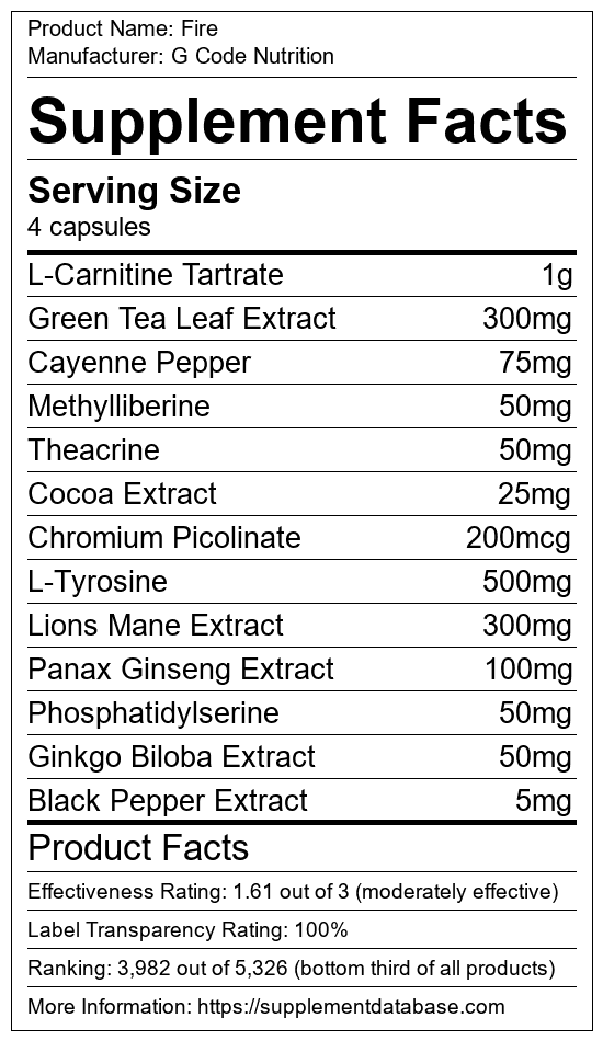 Fire is a fat burning supplement manufactured by G Code Nutrition. It ranks 538 out of 719 fat burning supplements and earned an overall thumbs-down recommendation based on seven factors including nutrition label transparency, ingredients, dosing, claims, research rating, and ranking.