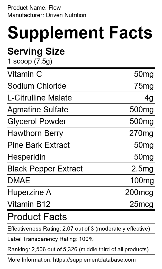 Flow is a pre-workout supplement manufactured by Driven Nutrition. It ranks 1,153 out of 1,898 pre-workout supplements and earned an overall thumbs-down recommendation based on seven factors including nutrition label transparency, ingredients, dosing, claims, research rating, and ranking.