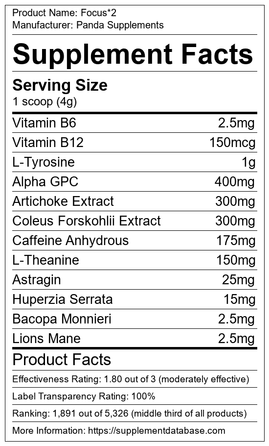 Focus is a cognitive enhancement supplement manufactured by Panda Supplements. It ranks 60 out of 173 cognitive enhancement supplements and earned an overall thumbs-up recommendation based on seven factors including nutrition label transparency, ingredients, dosing, claims, research rating, and ranking.