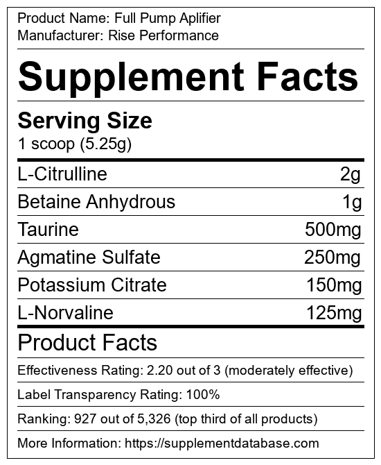 Full Pump Aplifier is a pre-workout supplement manufactured by Rise Performance. It ranks 417 out of 1,898 pre-workout supplements and earned an overall thumbs-up recommendation based on seven factors including nutrition label transparency, ingredients, dosing, claims, research rating, and ranking.