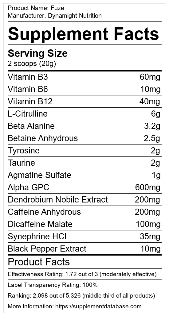 Fuze is a pre-workout supplement manufactured by Dynamight Nutrition. It ranks 991 out of 1,898 pre-workout supplements and earned an overall thumbs-up recommendation based on seven factors including nutrition label transparency, ingredients, dosing, claims, research rating, and ranking.