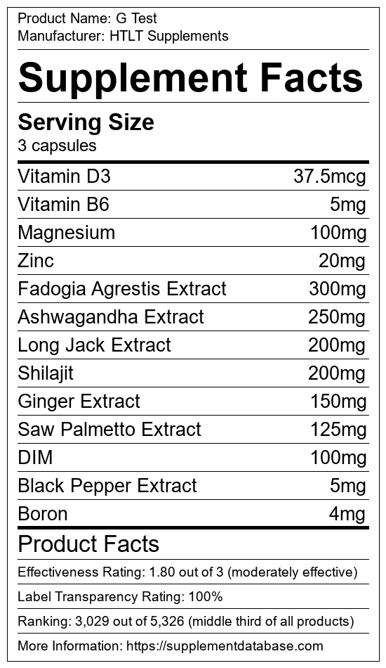 G Test is a testosterone booster manufactured by HTLT Supplements. It ranks 139 out of 321 testosterone boosters and earned an overall thumbs-down recommendation based on seven factors including nutrition label transparency, ingredients, dosing, claims, research rating, and ranking.