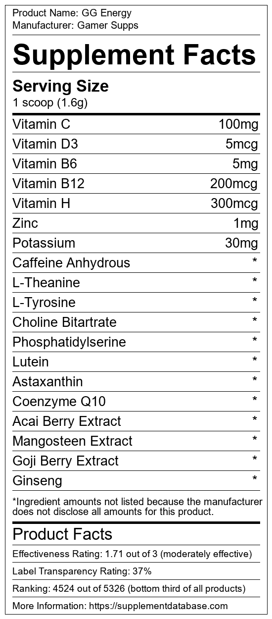 GG Energy is a gaming supplement manufactured by Gamer Supps. It ranks 39 out of 46 gaming supplements and earned an overall thumbs-down recommendation based on seven factors including nutrition label transparency, ingredients, dosing, claims, research rating, and ranking.