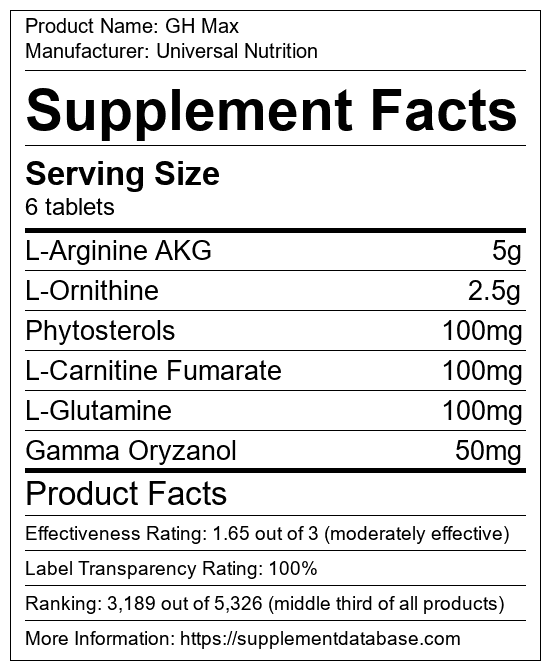 GH Max is a testosterone booster manufactured by Universal Nutrition. It ranks 183 out of 321 testosterone boosters and earned an overall thumbs-down recommendation based on seven factors including nutrition label transparency, ingredients, dosing, claims, research rating, and ranking.