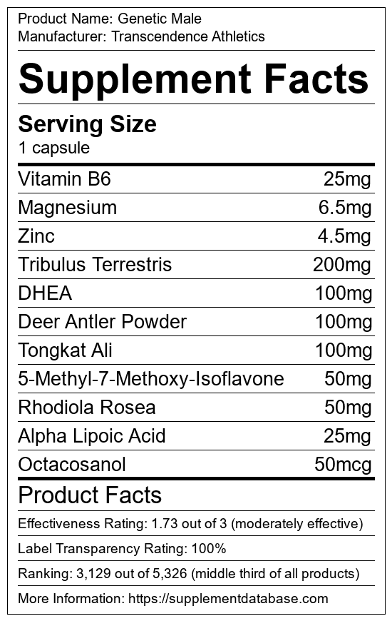 Genetic Male is a male enhancement supplement manufactured by Transcendence Athletics. It ranks 18 out of 35 male enhancement supplements and earned an overall thumbs-down recommendation based on seven factors including nutrition label transparency, ingredients, dosing, claims, research rating, and ranking.