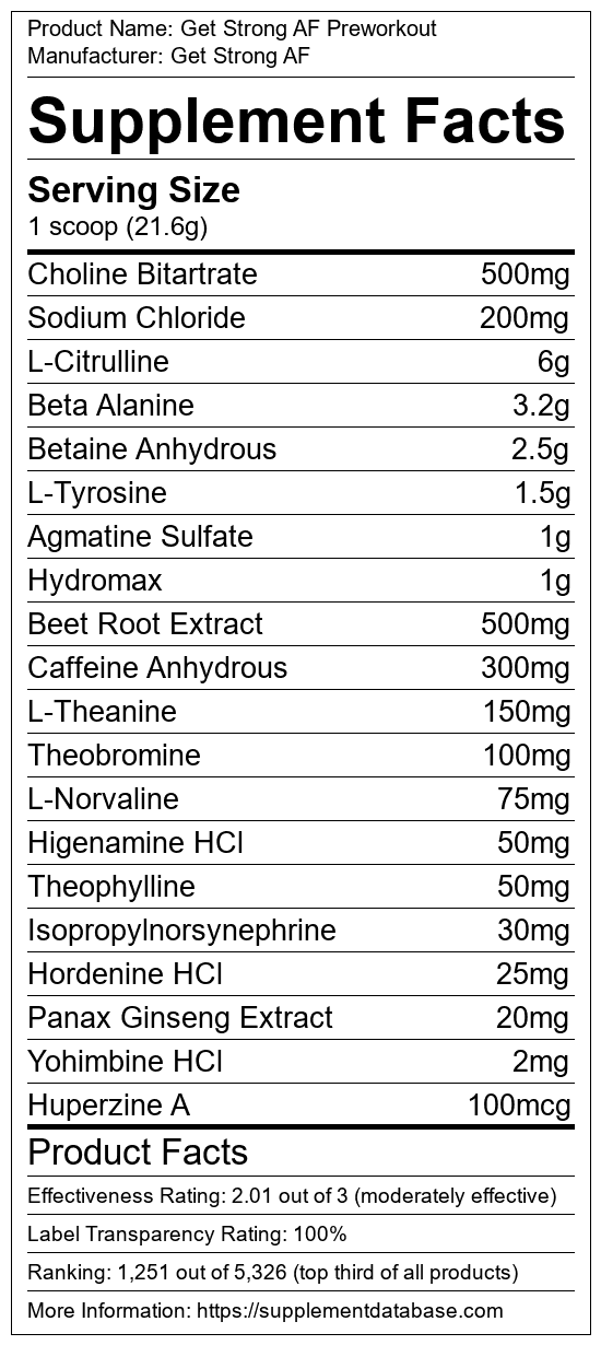 Get Strong AF Preworkout is a pre-workout supplement manufactured by Get Strong AF. It ranks 558 out of 1,898 pre-workout supplements and earned an overall thumbs-up recommendation based on seven factors including nutrition label transparency, ingredients, dosing, claims, research rating, and ranking.