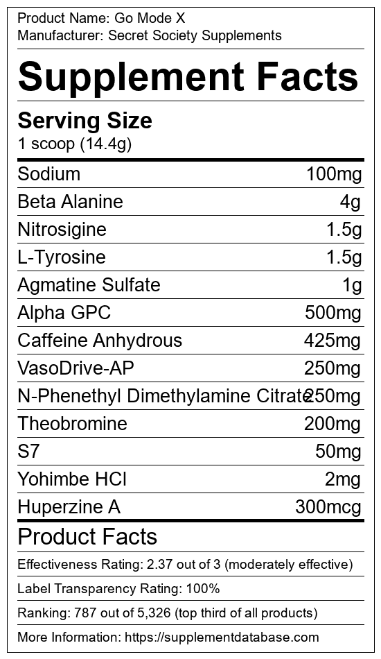 Go Mode X is a pre-workout supplement manufactured by Secret Society Supplements. It ranks 385 out of 1,898 pre-workout supplements and earned an overall thumbs-up recommendation based on seven factors including nutrition label transparency, ingredients, dosing, claims, research rating, and ranking.