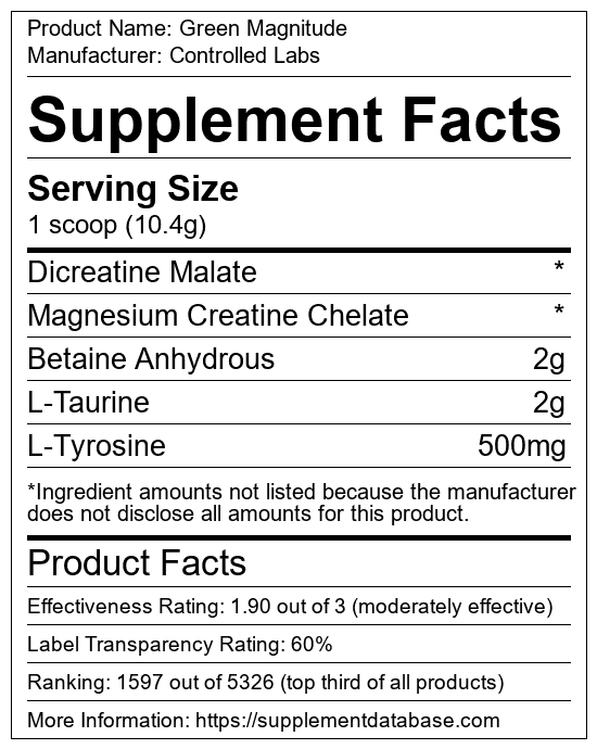 Green Magnitude is a post-workout supplement manufactured by Controlled Labs. It ranks 172 out of 515 post-workout supplements and earned an overall thumbs-up recommendation based on seven factors including nutrition label transparency, ingredients, dosing, claims, research rating, and ranking.
