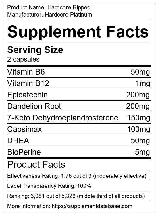Hardcore Ripped is a fat burning supplement manufactured by Hardcore Platinum. It ranks 432 out of 719 fat burning supplements and earned an overall thumbs-down recommendation based on seven factors including nutrition label transparency, ingredients, dosing, claims, research rating, and ranking.