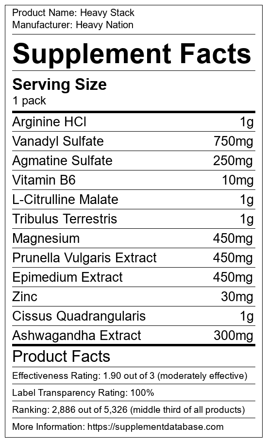 Heavy Stack is a testosterone booster manufactured by Heavy Nation. It ranks 106 out of 321 testosterone boosters and earned an overall thumbs-down recommendation based on seven factors including nutrition label transparency, ingredients, dosing, claims, research rating, and ranking.