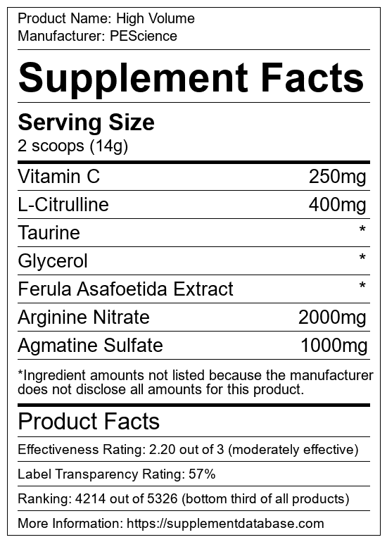 High Volume is a pre-workout supplement manufactured by PEScience. It ranks 1,715 out of 1,898 pre-workout supplements and earned an overall thumbs-down recommendation based on seven factors including nutrition label transparency, ingredients, dosing, claims, research rating, and ranking.