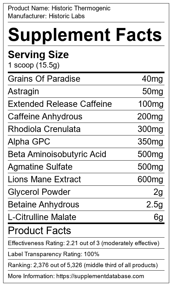 Historic Thermogenic is a fat burning supplement manufactured by Historic Labs. It ranks 265 out of 719 fat burning supplements and earned an overall thumbs-down recommendation based on seven factors including nutrition label transparency, ingredients, dosing, claims, research rating, and ranking.