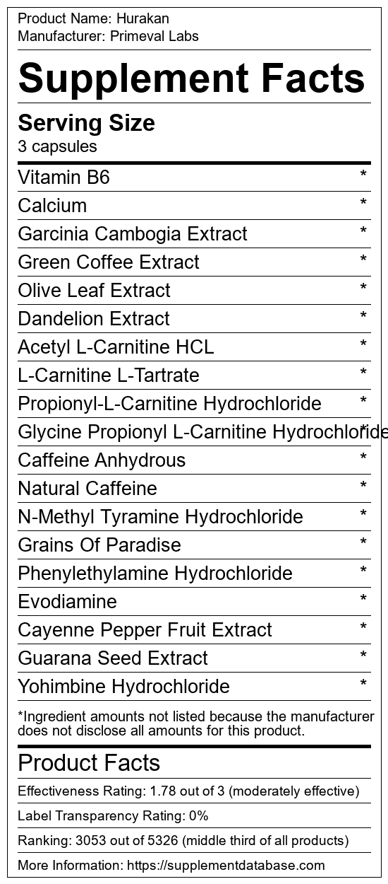 Hurakan is a fat burning supplement manufactured by Primeval Labs. It ranks 419 out of 719 fat burning supplements and earned an overall thumbs-down recommendation based on seven factors including nutrition label transparency, ingredients, dosing, claims, research rating, and ranking.