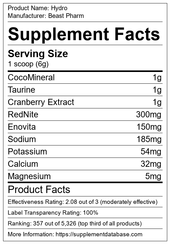 Hydro is an intra-workout supplement manufactured by Beast Pharm. It ranks 26 out of 339 intra-workout supplements and earned an overall thumbs-up recommendation based on seven factors including nutrition label transparency, ingredients, dosing, claims, research rating, and ranking.