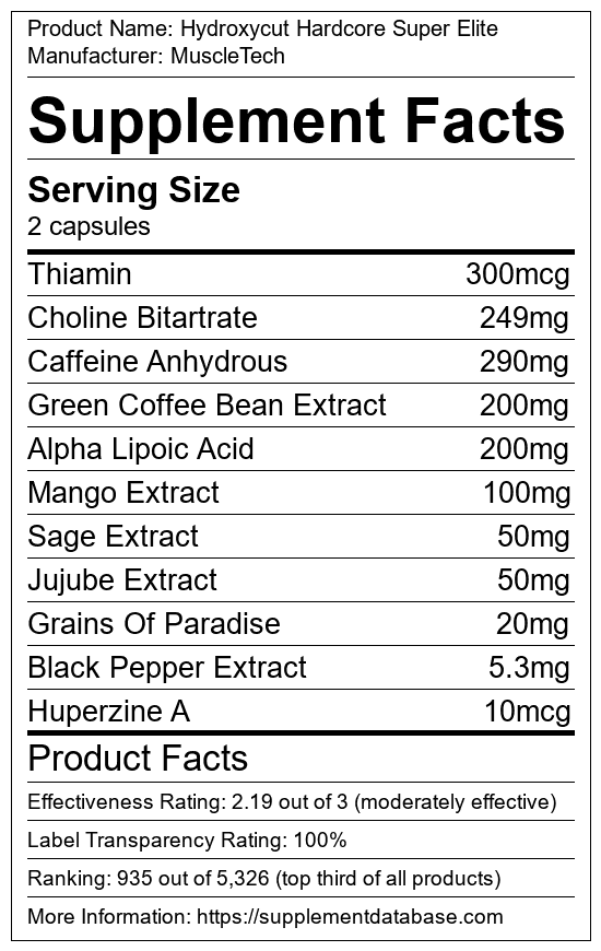 Hydroxycut Hardcore Super Elite is a fat burning supplement manufactured by MuscleTech. It ranks 68 out of 719 fat burning supplements and earned an overall thumbs-up recommendation based on seven factors including nutrition label transparency, ingredients, dosing, claims, research rating, and ranking.