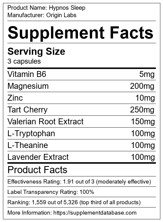 Hypnos Sleep is a sleep aid manufactured by Origin Labs. It ranks 123 out of 215 sleep aids and earned an overall thumbs-up recommendation based on seven factors including nutrition label transparency, ingredients, dosing, claims, research rating, and ranking.