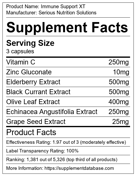 Immune Support XT is an immune system booster manufactured by Serious Nutrition Solutions. It ranks 5 out of 72 immune system boosters and earned an overall thumbs-up recommendation based on seven factors including nutrition label transparency, ingredients, dosing, claims, research rating, and ranking.