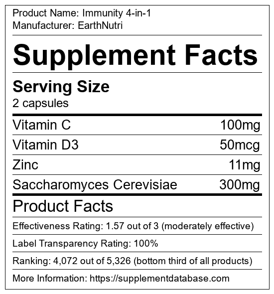 Immunity 4-in-1 is an immune system booster manufactured by EarthNutri. It ranks 52 out of 72 immune system boosters and earned an overall thumbs-down recommendation based on seven factors including nutrition label transparency, ingredients, dosing, claims, research rating, and ranking.