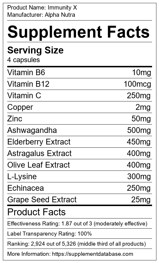 Immunity X is an immune system booster manufactured by Alpha Nutra. It ranks 27 out of 72 immune system boosters and earned an overall thumbs-down recommendation based on seven factors including nutrition label transparency, ingredients, dosing, claims, research rating, and ranking.