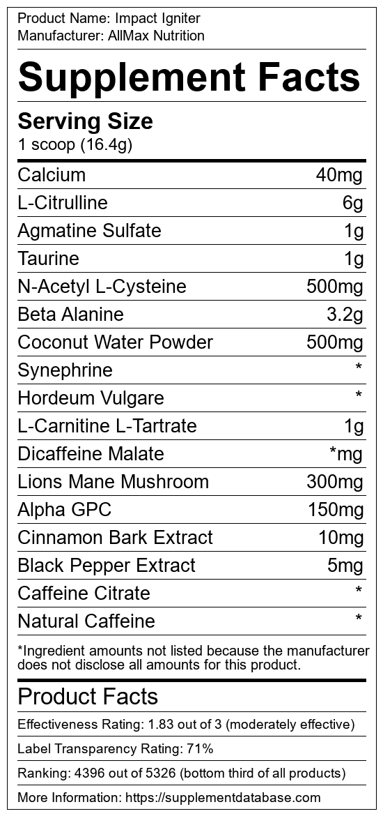 Impact Igniter is a pre-workout supplement manufactured by AllMax Nutrition. It ranks 1,753 out of 1,898 pre-workout supplements and earned an overall thumbs-down recommendation based on seven factors including nutrition label transparency, ingredients, dosing, claims, research rating, and ranking.