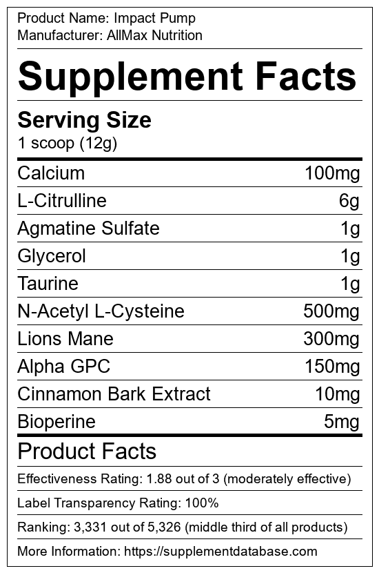 Impact Pump is a pre-workout supplement manufactured by AllMax Nutrition. It ranks 1,288 out of 1,898 pre-workout supplements and earned an overall thumbs-down recommendation based on seven factors including nutrition label transparency, ingredients, dosing, claims, research rating, and ranking.