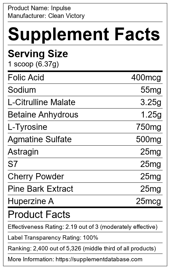 Inpulse is a pre-workout supplement manufactured by Clean Victory. It ranks 1,125 out of 1,898 pre-workout supplements and earned an overall thumbs-down recommendation based on seven factors including nutrition label transparency, ingredients, dosing, claims, research rating, and ranking.